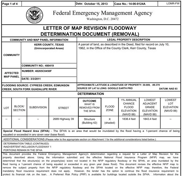 FEMA’s approval of a flood map designation appeal at Camp Mystic, issued on October 15, 2013. FEMA would later provide subsequent approvals for additional Camp Mystic buildings in 2019 and 2020. Credit: AP